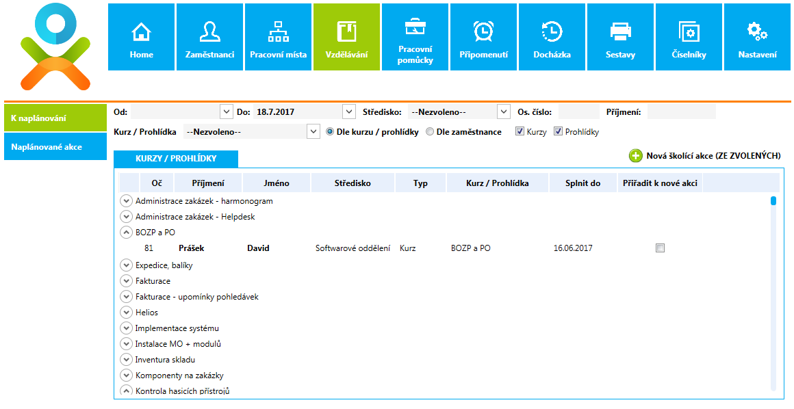 Ukázka z modulu Vzdělávání - v tabulce kurzy/prohlídky vidíme kurzy k naplánování a po rozkliknutí i účastníky, kteří mají případnou prohlídku či kurz splnit.